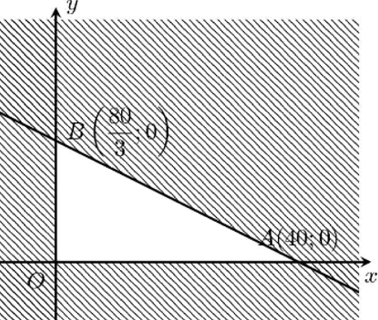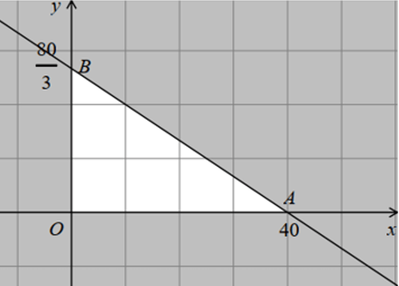 Hàm số $f(x ; y)=5 x+5 y$ sẽ đạt giá trị lớn nhất trên miền nghiệm của hệ bất phương trình (*) khi $(x ; y)$ là toạ độ một trong các đỉnh $O(0 ; 0), A(40 ; 0)$, $B\left(0 ; \frac{80}{3}\right)$