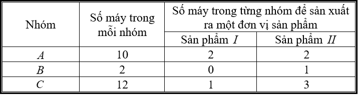 Câu 2. Có ba nhóm máy $A$, $B$, $C$ dùng để sản xuất ra hai loại sản phẩm $I$ và $II$. Để sản xuất một đơn vị sản phẩm mỗi loại lần lượt dùng các máy thuộc các nhóm khác nhau. Số máy trong một nhóm của từng nhóm cần thiết để sản xuất ra một đơn vị sản phẩm thuộc mỗi loại được cho trong bảng sau: