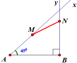 Câu 43. Cho hai tia ${Ax}$, ${By}$ với $AB=100$$\left( cm \right)$, $\widehat{xAB}={{45}^{0}}$ và $By\bot AB$. Chất điểm $X$ chuyển động trên tia ${Ax}$ bắt đầu từ $A$ với vận tốc $3\sqrt{2}$$\left( cm/s \right)$, cùng lúc đó chất điểm $Y$ chuyển động trên tia ${By}$ bắt đầu từ $B$ với vận tốc $4$$\left( cm/s \right)$. Sau $t$ (giây) chất điểm $X$ di chuyển được đoạn đường ${AM}$, chất điểm $Y$ di chuyển được đoạn đường ${BN}$. Tìm giá trị nhỏ nhất của ${MN}$.