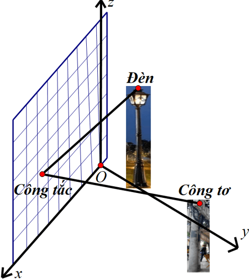 Chọn hệ trục tọa độ ${Oxyz}$ như sau: mặt phẳng ${Oxy}$ là mặt đất, trục ${Ox}$ là đường giao bức tường và mặt đất, trục ${Oy}$ qua chân cột đèn, trục ${Oz}$ là đường thẳng nằm trên bức tường, đơn vị trên các trục là mét và chiều các trục như hình vẽ. Coi chân cột đèn là điểm ${M}$, chân cột công tơ là điểm ${N}$, hoành độ và tung độ điểm ${N}$ là số dương.