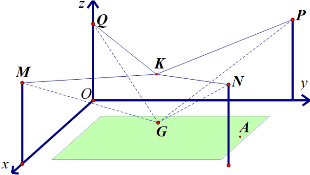 Câu 5. Người ta cần lắp một camera phía trên sân bóng để phát sóng truyền hình một trận bóng đá, camera có thể di động để luôn thu được hình ảnh rõ nét về diễn biến trên sân. Các kĩ sư dự định trồng bốn chiếc cột cao 30 m và sử dụng hệ thống cáp gắn vào bốn đầu cột để giữ camera ở vị trí mong muốn. Mô hình thiết kế được xây dựng như sau: Trong hệ trục toạ độ ${Oxyz}$, các đỉnh của bốn chiếc cột lần lượt là các điểm $M(90;0;30)$, $N(90;120;30)$, $P(0;120;30)$, $Q(0;0;30)$ (tham khảo hình dưới). Giả sử ${K}$ là vị trí ban đầu của camera có cao độ bằng 25 và ${KM=KN=KP=KQ}$. Để theo dõi quả bóng đến vị trí $A$, camera được hạ thấp theo phương thẳng đứng xuống điểm ${G}$ có cao độ bằng 19.