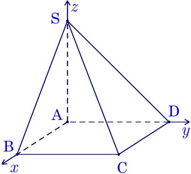 Câu 1. Cho hình chóp $S.ABCD$ có đáy $ABCD$ là hình chũ nhật và cạnh $SA$ vuông góc với mặt phẳng đáy. Biết $AB=1,AD=2$ và $SA=3$. Xét hệ trục tọa độ $Oxyz$ với $O$ trùng $A$; các tia $Ox$, ${Oy}$, ${Oz}$ lần lượt trùng với các tia ${AB}$, ${AD}$, ${AS}$ (như hình vẽ).