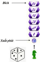 Câu 4. Trong một trò chơi, con ngựa của bạn Toàn đang đứng ở vị trí xuất phát (như hình vẽ). Luật chơi như sau: Để di chuyển con ngựa, bạn Toàn cần gieo một con xúc xắc có sáu mặt cân đối, đồng chất. Ở mỗi lượt chơi, bạn có tối đa ba lần gieo. Ở lần gieo thứ nhất, con ngựa di chuyển đến ô có số thứ tự bằng số tương ứng với số chấm gieo được của con xúc xắc. Từ những lần gieo sau, nếu tổng của số tương ứng với số chấm gieo được của con xúc xắc và số tương ứng ghi ở ô con ngựa đang đứng lớn hơn 6 thì con ngựa sẽ đứng yên, còn nếu tổng này nhỏ hơn hoặc bằng 6 thì con ngựa được di chuyển số ô bằng số chấm gieo được. Con ngựa này gọi là về đích nếu nó đến được ô số 6.