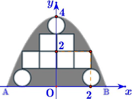 Phương trình Parabol có dạng $y=a{{x}^{2}}+c$. Do Parabol qua các điểm $\left( 0;4 \right)$ và $\left( 2;2 \right)$ nên ta được $\left\{ \begin{array}{} c=4 \\ 4a+c=2 \\ \end{array}\Rightarrow \left\{ \begin{array}{} a=-\dfrac{1}{2} \\ c=4 \\ \end{array} \right. \right.$. Suy ra Parabol: $y=-\dfrac{1}{2}{{x}^{2}}+4$.