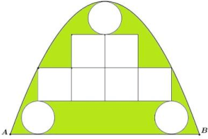 Câu 2. Một củ̉a vòm có dạng hình parabol được lắp các tấm kính hình tròn đường kính $1m$ và các tấm kính hình vuông có cạnh $1m$ như hình vẽ. Phần còn lại của cửa được sơn màu trang trí với mức giá 1,2 triệu đồng $/{{{m}}^{2}}$. Chi phí sơn màu là bao nhiêu triệu đồng (kết quả làm tròn đến hàng phần chục)?