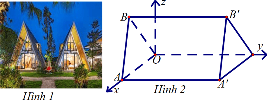 Câu 6. Những căn nhà gỗ trong Hình 1 được phác thảo dưới dạng một hình lăng trụ đứng tam giác $OAB.{O}'{A}'{B}'$ như trong Hình 2. Với hệ trục toạ độ ${Oxyz}$ thể hiện như Hình 2 (đơn vị đo lấy theo centimét), hai điểm ${A}'$ và ${B}'$ có tọa độ lần lượt là $\left( 240;450;0 \right)$ và $\left( 120;450;300 \right)$. Mỗi căn nhà gỗ có chiều dài là $a\text{ cm}$, chiều rộng là $b~\text{cm}$, mỗi cạnh bên của mặt tiền có độ dài là $c~\text{cm}$. Tính $a+b+c$ (làm tròn đến hàng đơn vị) ?