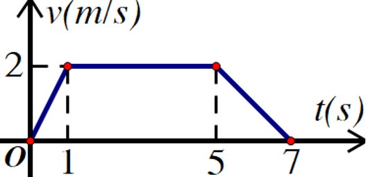b) Hàm số $v(t)$ được cho bởi công thức $v(t)=\left\{ \begin{align} & 2t,\,\,\,\,\,\,\,\,\,\,\,0\le t<1 \\ & 2,\,\,\,\,\,\,\,\,\,\,\,\,\,1\le t<5 \\ & -t+7,\,\,\,5\le t\le 7 \\ \end{align} \right.$.