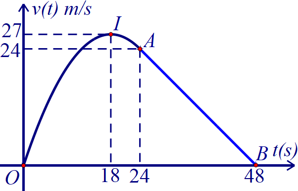 Câu 2. Trong một bài kiểm tra vận hành, một ô tô xuất phát từ trạng thái nghỉ. Xe tăng tốc đến vận tốc cực đại, sau đó thực hiện quá trình hãm phanh nhẹ nhàng để dừng hẳn. Toàn bộ quá trình kéo dài 48 giây. Đồ thị vận tốc $v(t)$ của ô tô được cho như hình vẽ, đồ thị hàm số $v(t)$ trên đoạn $[0\,;\,24]$ là một phần của parabol, và trên đoạn $[24\,;\,48]$ là đoạn thẳng $AB$.