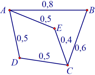 Câu 2. Một công ty du lịch thiết kế tour đi bộ khám phá khu phố cổ gồm 5 địa điểm tham quan chính $A,\,\,B,\,\,C,\,\,D,\,\,E$. Sơ đồ các tuyến đường và chiều dài của chúng (đơn vị: kilômét) được cho như hình vẽ.