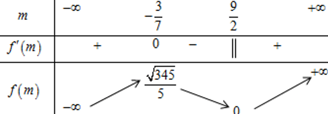 $\Rightarrow {f}'\left(m\right)=\dfrac{14{{m}^{2}}-57m-27}{\left|9-2m\right|{{\left(\sqrt{{{m}^{2}}-2m+6}\right)}^{3}}},$ với $m\ne \dfrac{9}{2},$ ${f}'\left(m\right)=0\Leftrightarrow \left[\begin{align}&m=\dfrac{9}{2}\\ &m=\dfrac{-3}{7}\end{align}\right.$