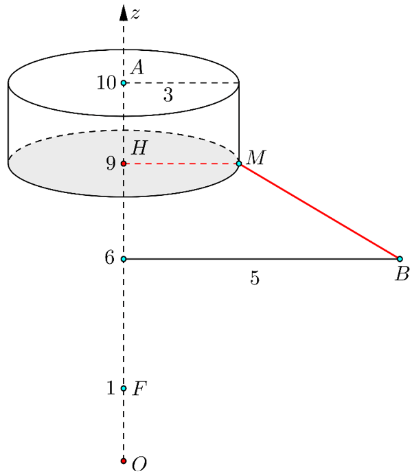 Câu 1. Trong không gian $Oxyz,$ cho $A\left(0;0;10\right),B\left(3;4;6\right).$ Xét các điểm $M$ thay đổi sao cho tam giác $OAM$ không có góc tù và có diện tích bằng 15. Giá trị nhỏ nhất của độ dài đoạn thẳng $MB$ thuộc khoảng nào dưới đây?