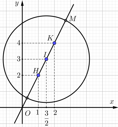 Hình tròn $\left(C\right)$ có tâm $I\left(\dfrac{3}{2};3;0\right)$ là trung điểm của $HK$ và bán kính $R=\dfrac{\sqrt{29}}{2}$.