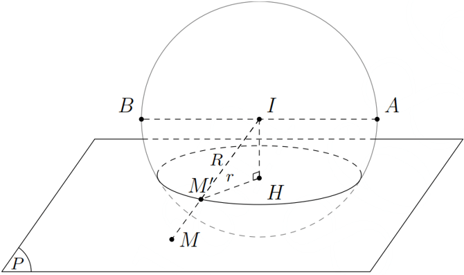 Nên mặt cầu $\left(S\right)$ sẽ cắt mặt phẳng $\left(P\right)$ theo một đường tròn có tâm $H$ là hình chiếu của $I$ trên mặt phẳng $\left(P\right)$ và bán kính $r=\sqrt{\dfrac{A{{B}^{2}}}{4}-{{d}^{2}}}=\dfrac{\sqrt{5}}{2}$.