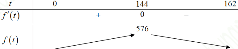 Suy ra ${f}'\left( t \right)=0\Leftrightarrow 3+\frac{324-3t}{12\sqrt{81-\frac{t}{2}}}=0\Leftrightarrow 36\sqrt{81-\frac{t}{2}}=3t-324$ $\Leftrightarrow \sqrt{81-\frac{t}{2}}=\frac{t}{12}-9$ $\Leftrightarrow \left\{ \begin{align} & t\ge 108 \\ & 81-\frac{t}{2}={{\left( \frac{t}{12}-9 \right)}^{2}} \\ \end{align} \right.$ $\Leftrightarrow t=144$.