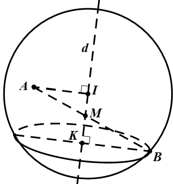 Gọi $M'$ là giao điểm của $IM$ và mặt cầu $\left(S\right)$, khi đó $\widehat{AMB}<\widehat{AM'B}={{90}^{{}^\circ}}$.