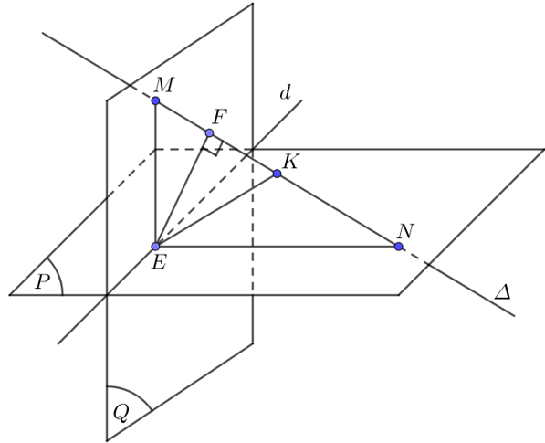 Trong $\left( Q \right),ME\bot d$ tại $E$. Suy ra $ME\bot \left( P \right)\Rightarrow ME\bot NE\Rightarrow \Delta MEN$ vuông tại $E$