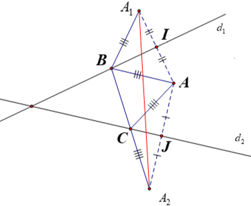 + Gọi ${{A}_{1}},\,{{A}_{2}}$ lần lượt là điểm đối xứng của $A$ qua ${{d}_{1}}$ và ${{d}_{2}}$.