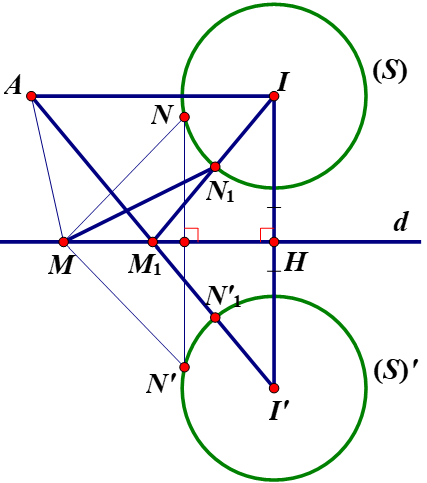 Gọi ${{M}_{1}}=A{I}'\cap d$, ${{{N}'}_{1}}=A{I}'\cap\left({{S}'}\right)$, ${{N}_{1}}={{M}_{1}}I\cap\left(S\right)$, ${N}'$ đối xứng với $N$ qua $d$ (như hình vẽ).