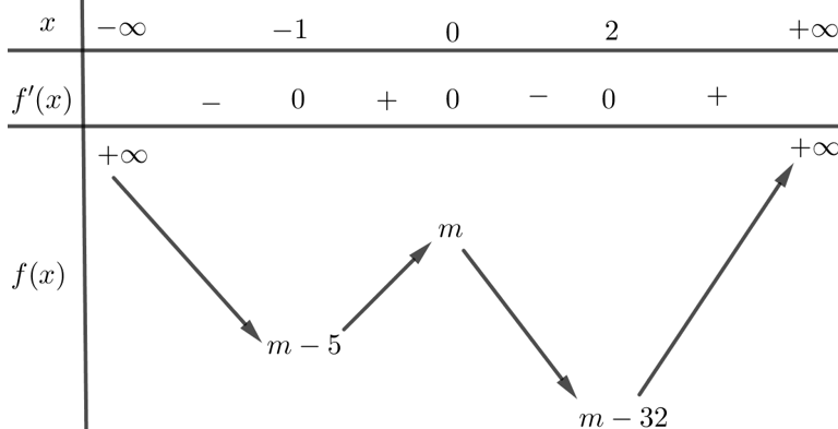 Xét hàm số $f\left(x\right)=3{{x}^{4}}-4{{x}^{3}}-12{{x}^{2}}+m\Rightarrow {f}'\left(x\right)=12{{x}^{3}}-12{{x}^{2}}-24x$