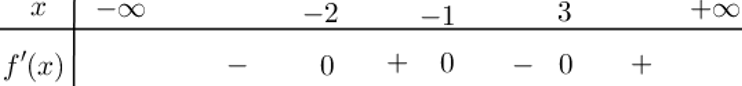 ${f}'(x)=0$ $\Leftrightarrow \left[ \begin{array}{*{35}{l}}x=0 \\x=-1. \\ x=2 \\\end{array} \right.$ Dễ thấy $f'(x)<0,\,\,\forall x<-1$.
