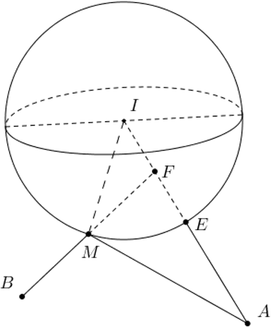 Vì $F$ nằm trong $\left( S \right)$ và $B$ nằm ngoài $\left( S \right)$ nên dấu $''=''$ xảy ra khi $M=BF\cap \left( S \right)$.
